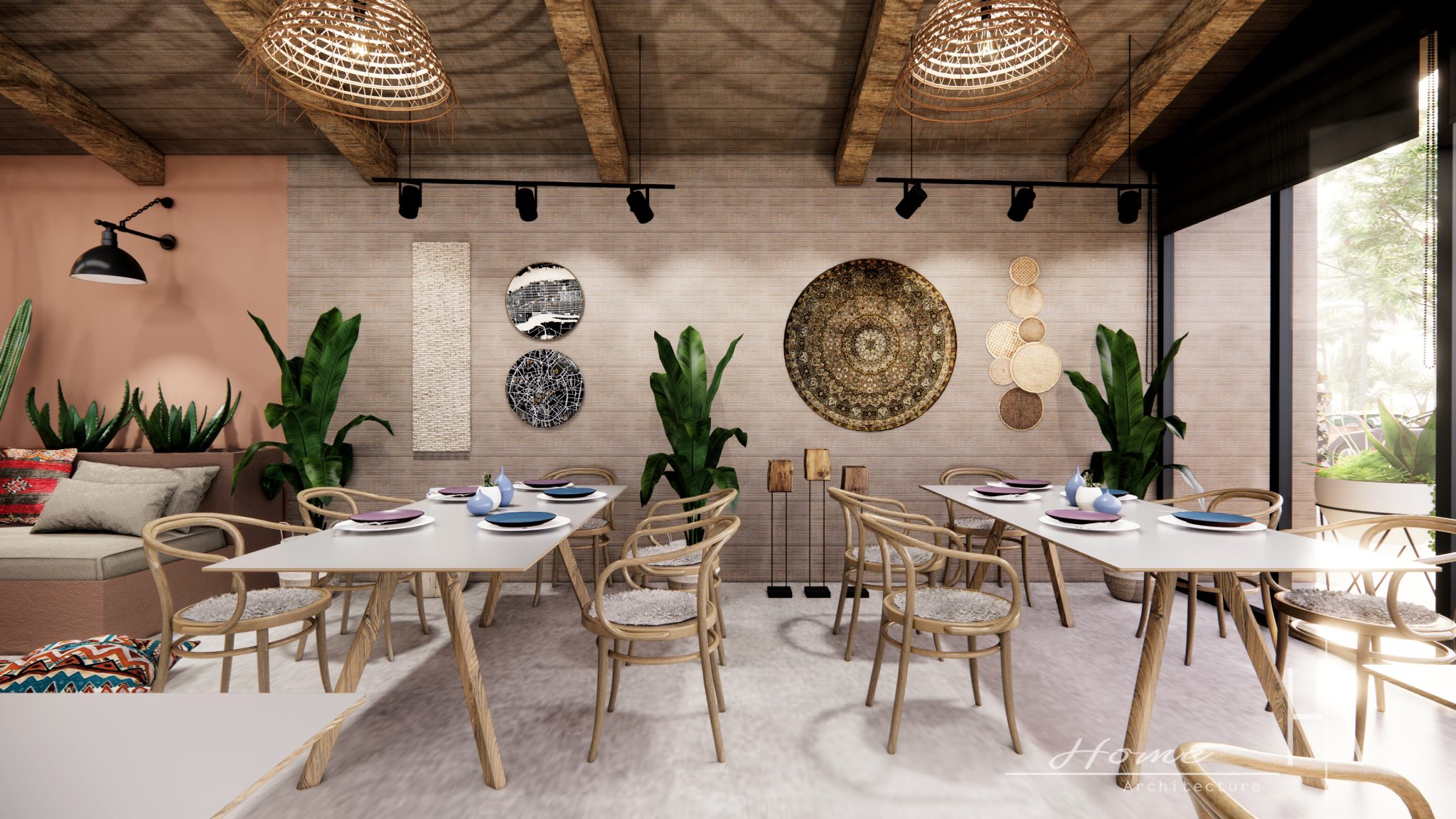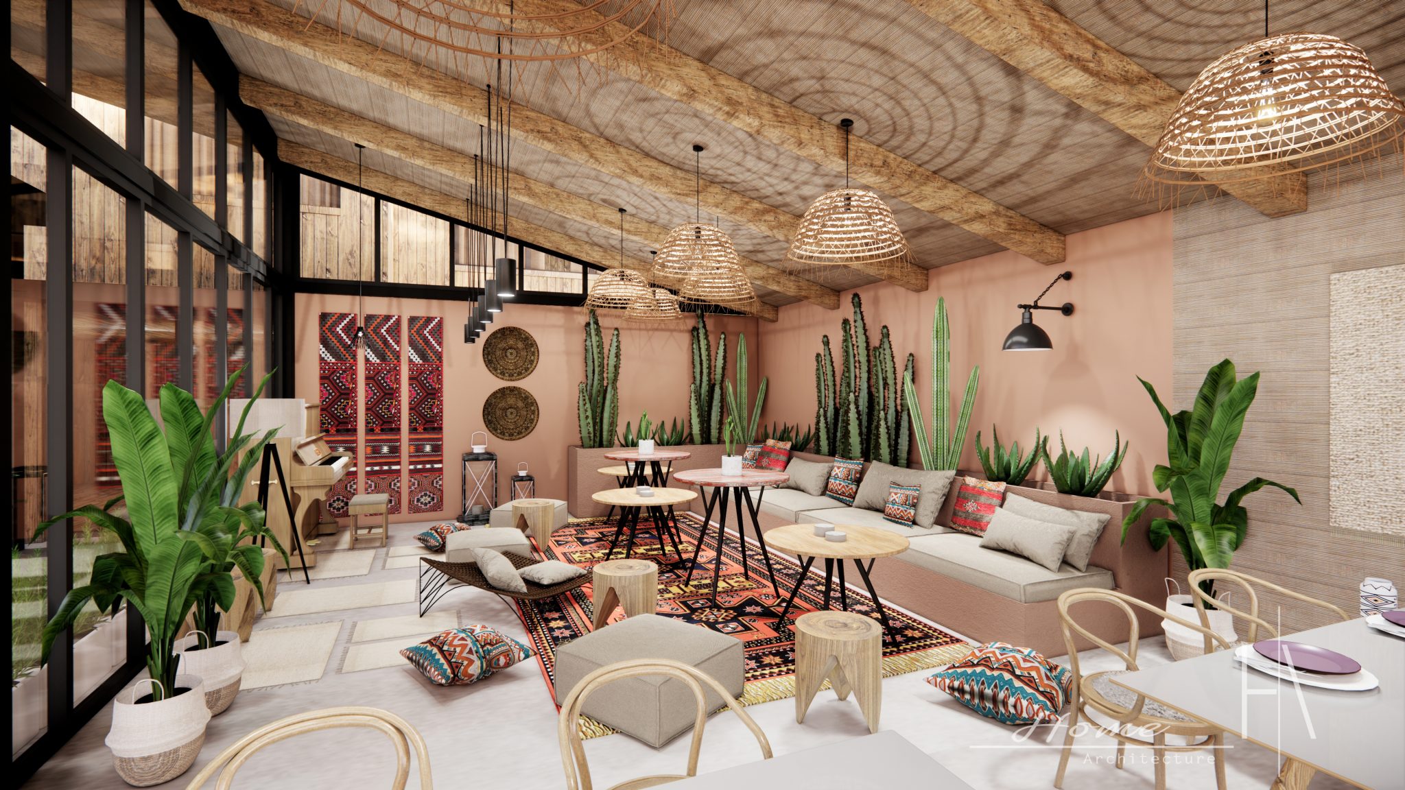 The seating areas showcase a diverse mix of bohemian-inspired furniture. Comfortable and mismatched vintage sofas, vibrant cushions and poufs, and handwoven rugs create cozy nooks and lounging spaces where patrons can unwind, have conversations, and embrace the carefree spirit of bohemia.