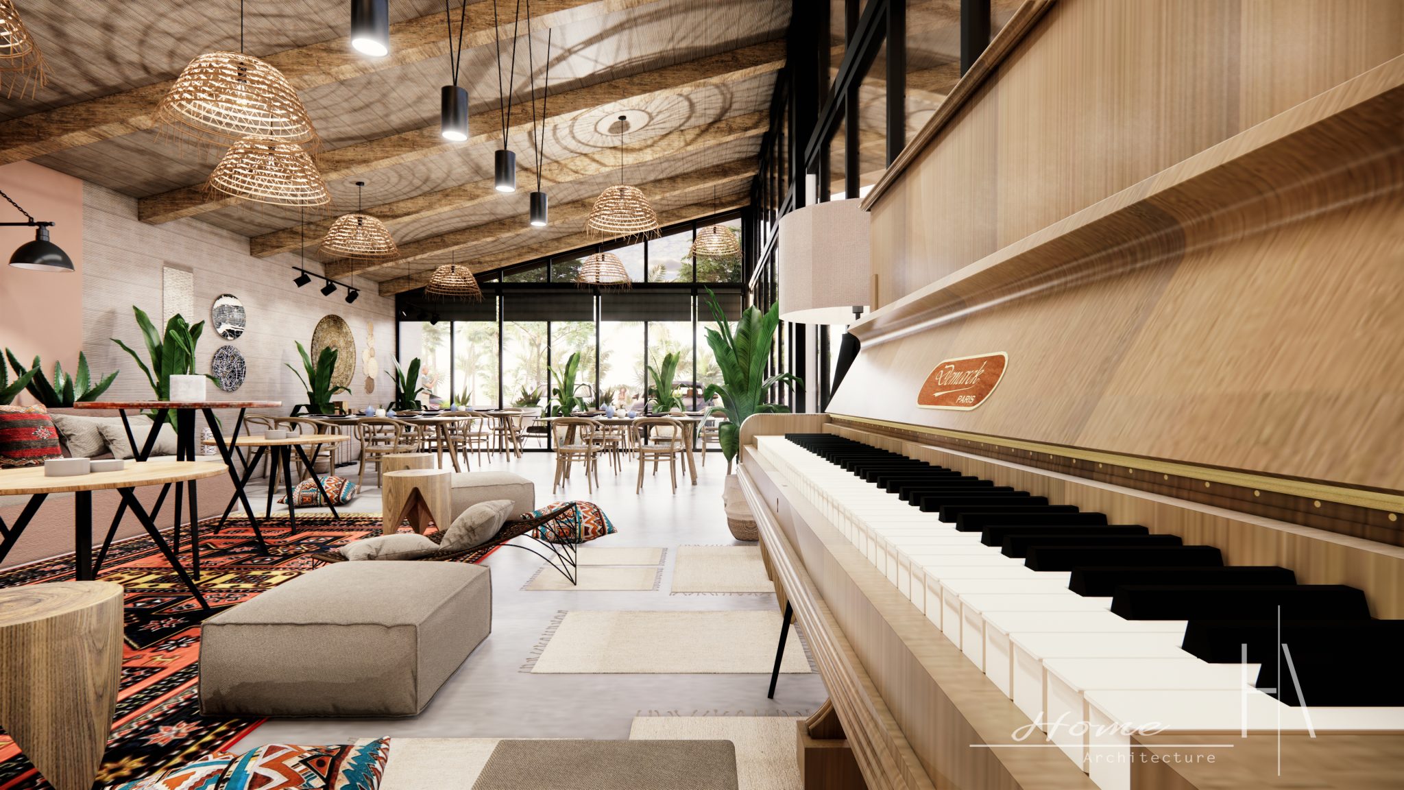 Drawing inspiration from the bohemian lifestyle and embracing a sense of unconventional beauty, our bar boasts an organic and rustic architectural design fused with artistic elements.