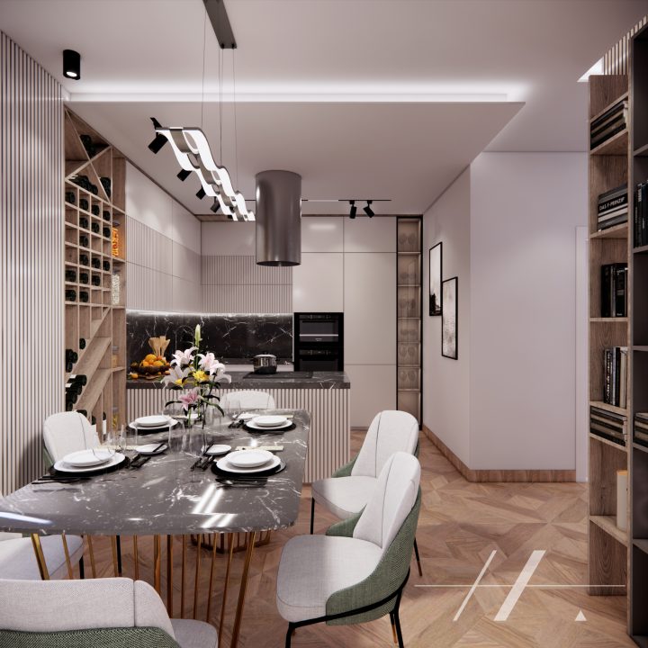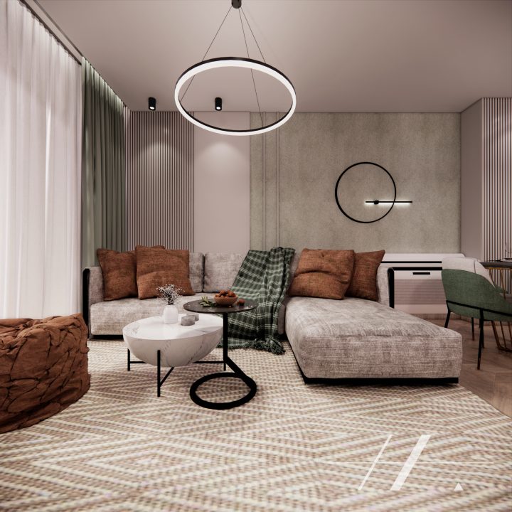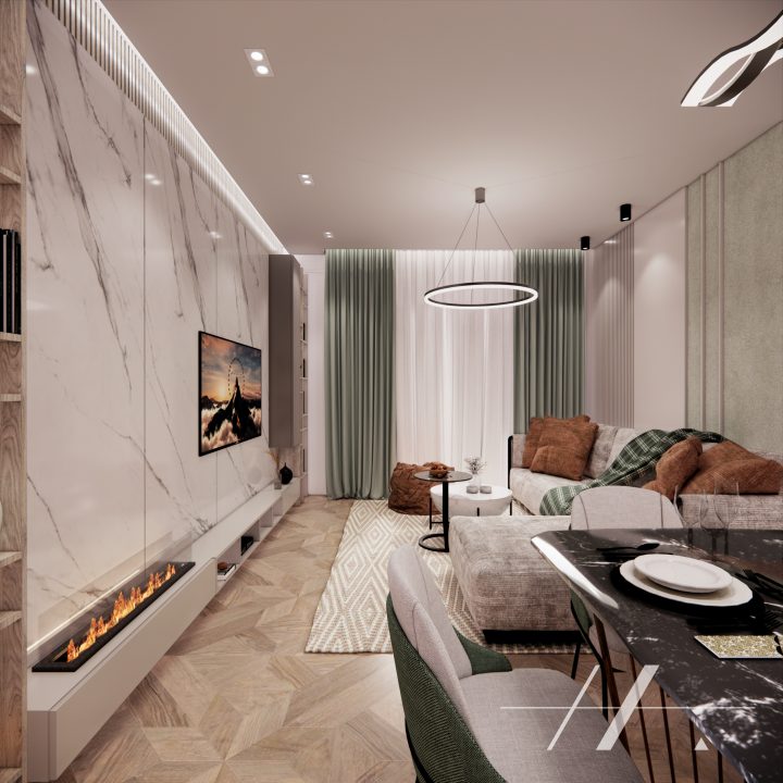 This s a captivating interior design project that brings the soothing tones of soft green and brown into the living room and kitchen, creating a harmonious and inviting space for relaxation and socializing.