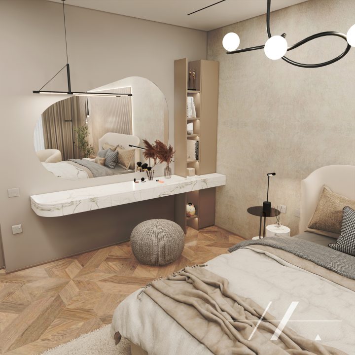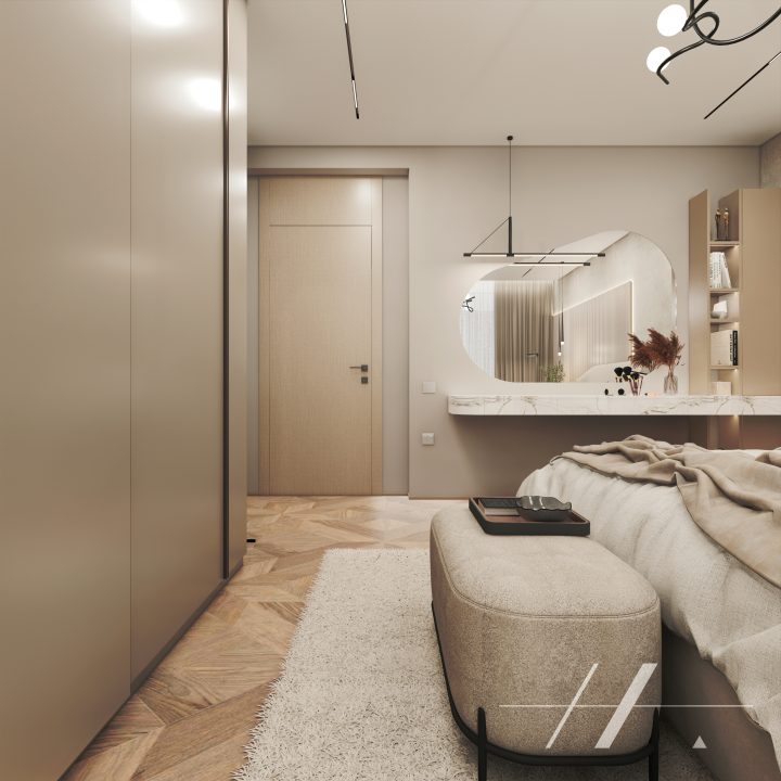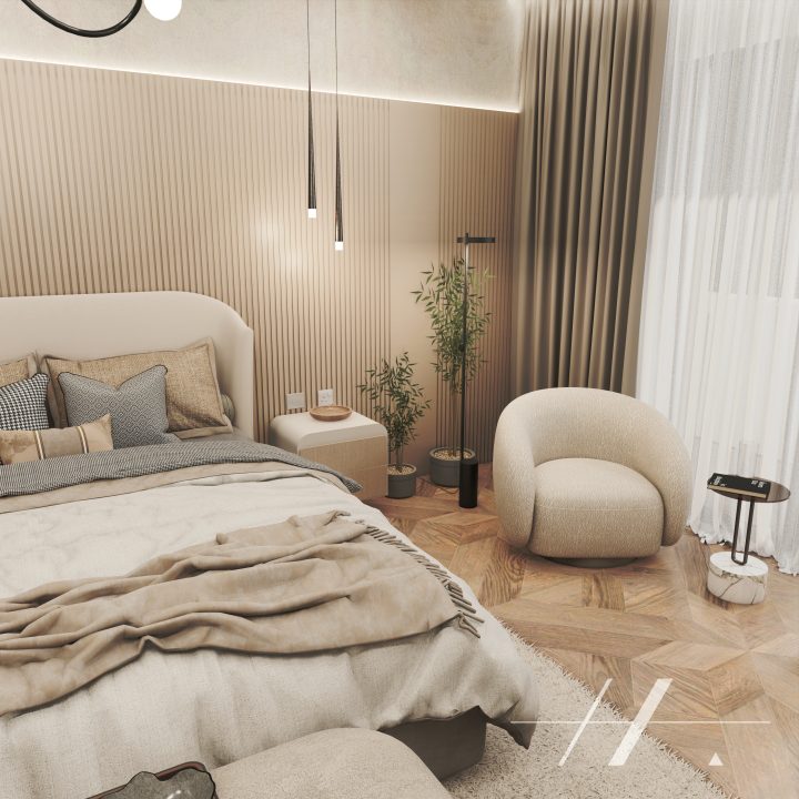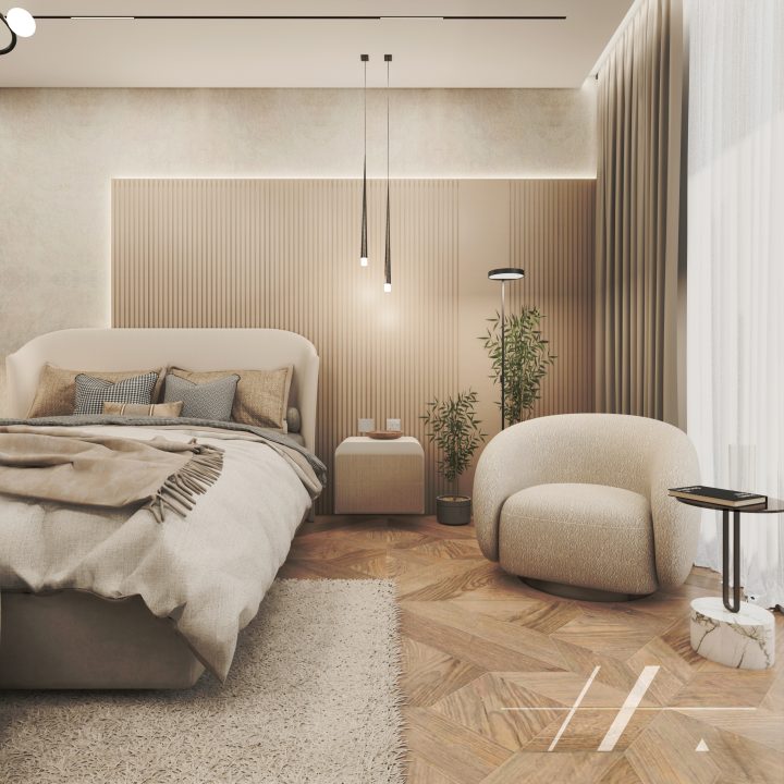 The bedroom is adorned in a palette of cream tones, evoking a sense of calm and tranquility. A sumptuous cream-colored bed takes center stage, adorned with soft bedding and throw pillows in milky hues. Ethereal drapes in a sheer fabric gently frame the windows, allowing natural light to filter through and create an airy, dreamlike atmosphere.