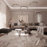 In the living room, plush sofas and armchairs upholstered in soft nude fabrics create a cozy seating area. Accent pillows in earthy brown tones add warmth and complement the natural hues of wooden furniture and flooring. Large windows allow natural light to flood the space, enhancing the connection with the outdoors.